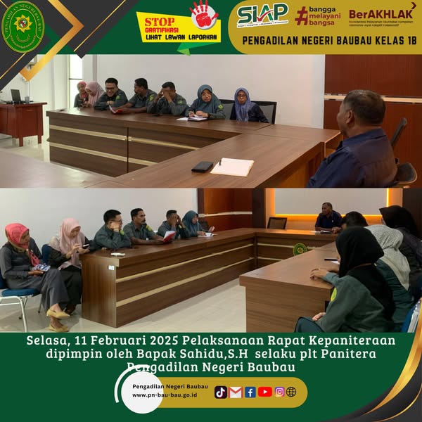 Selasa, 12 Februari 2025, plt. Panitera Pengadilan Negeri Baubau Bpk. Sahidu, S.H., bersama memimpin langsung Rapat berjenjang Bagian Kepaniteraan Bulan Februri Tahun 2025. Rapat diikuti Oleh Para Panmud, PP, JS/JSP, Staf dan PPNPN Kepaniteraan.
