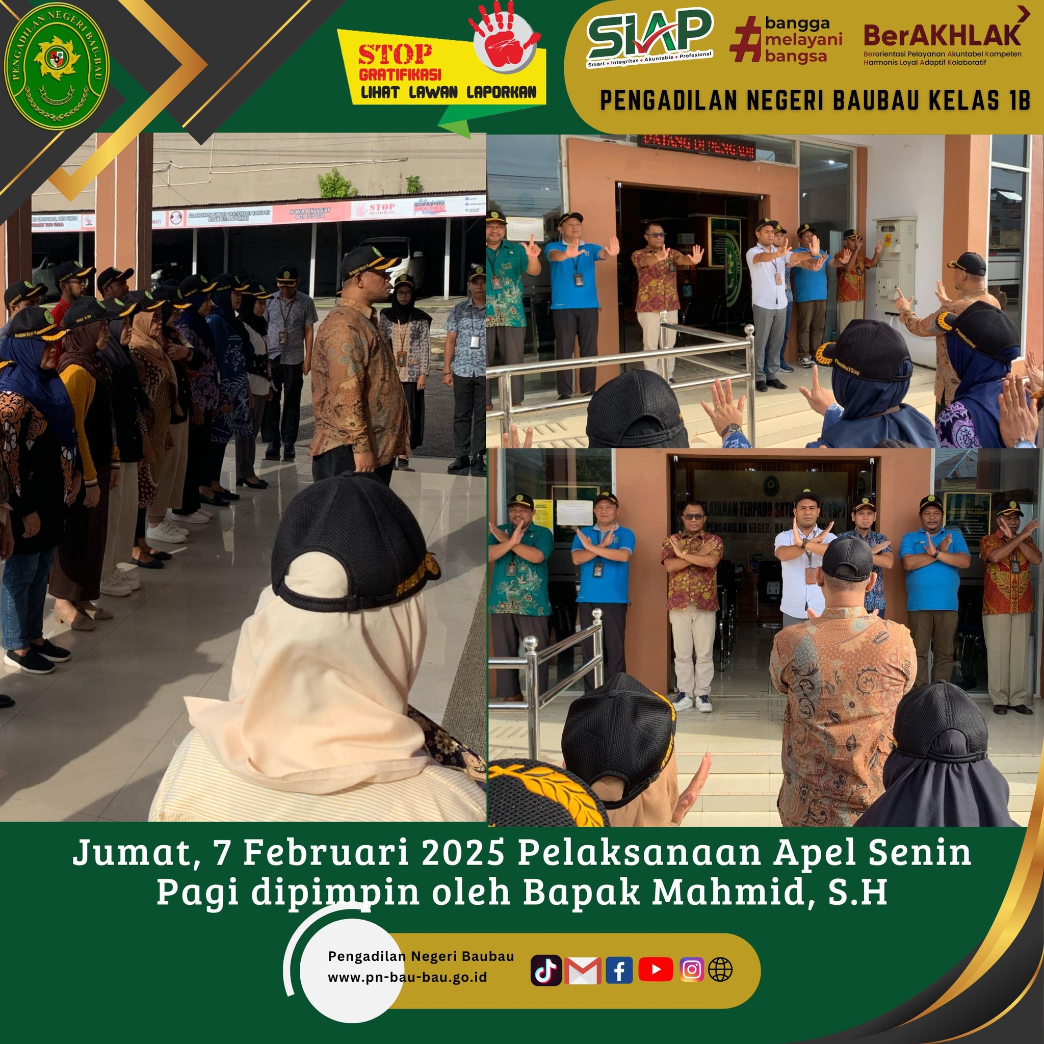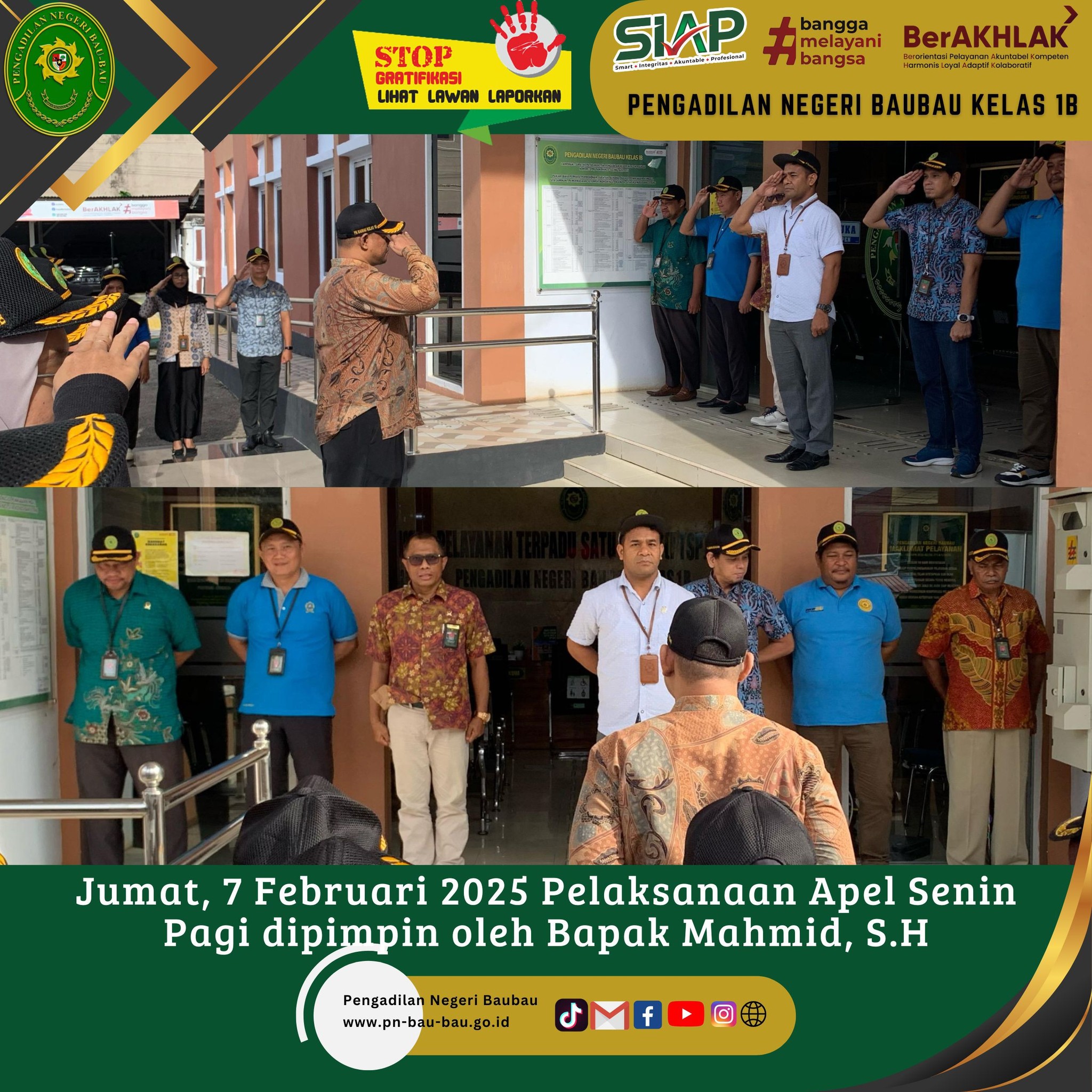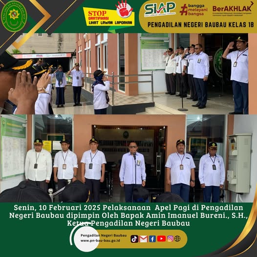 Senin, 10 Februari 2025 Pelaksanaan Apel Senin Pagi di Pengadilan Negeri Baubau dipimpin oleh Bpk Amin Imanuel Bureni.,S.H. M.H Ketua Pengadilan Negeri Baubau.