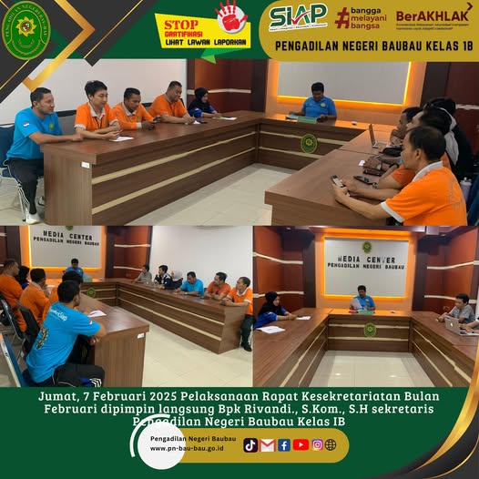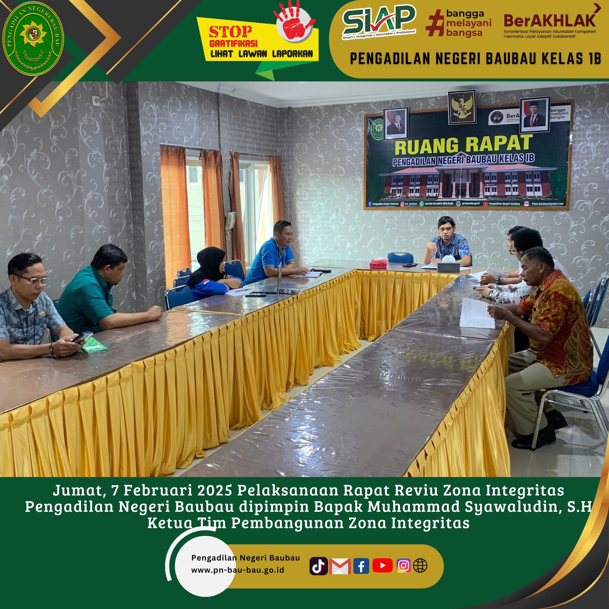 Jumat, 7 Februari 2025 Pelaksanaan Rapat Reviu Zona Integritas Pengadilan Negeri Baubau Tahun 2025 dipimpin Bapak Muhammad Syawaludin, S.H selaku Ketua Tim Pembangunan Zona Integritas.