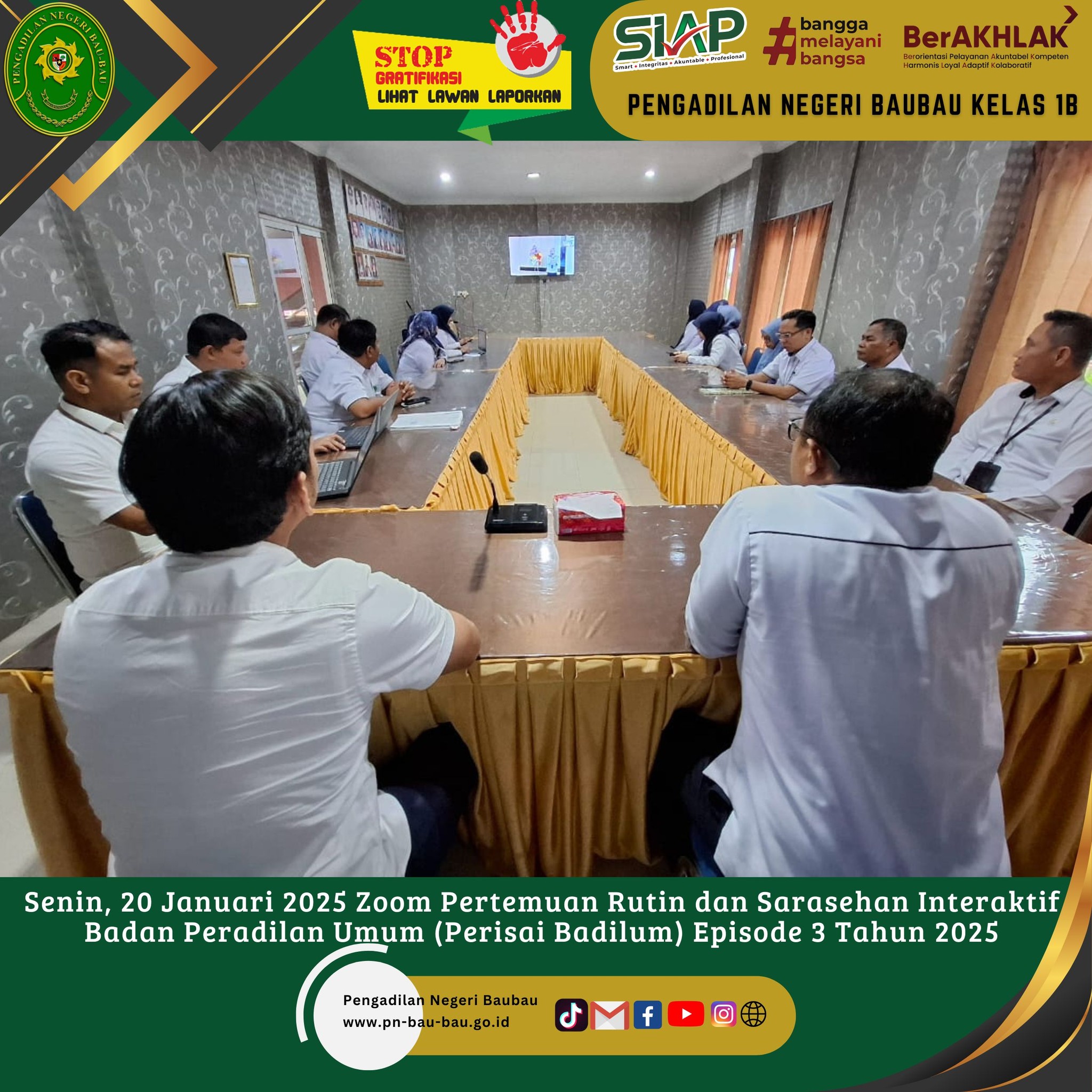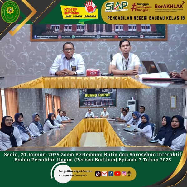Ketua Pengadilan Negeri Baubau Bapak Amin Imanuel Bureni.,S.H.,M.H mengikuti Kegiatan Zoom Pertemuan Rutin dan Sarasehan Interaktif Badan Peradilan Umum (Perisai Badilum) Episode 3 Tahun 2025 dengan didampingi oleh Wakil Ketua, Plt. Panitera, Sekretaris, Para Hakim serta jajaran Pegawai Kepaniteraan dan Kesekretariatan Pengadilan Negeri Baubau.