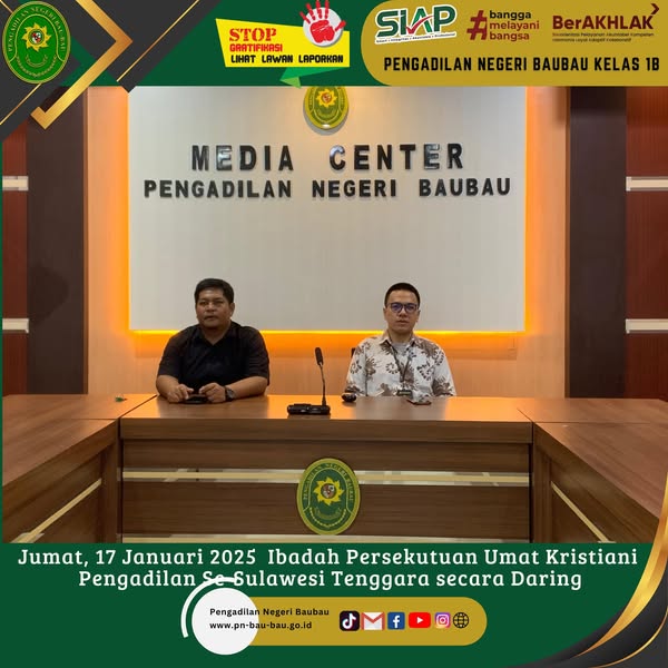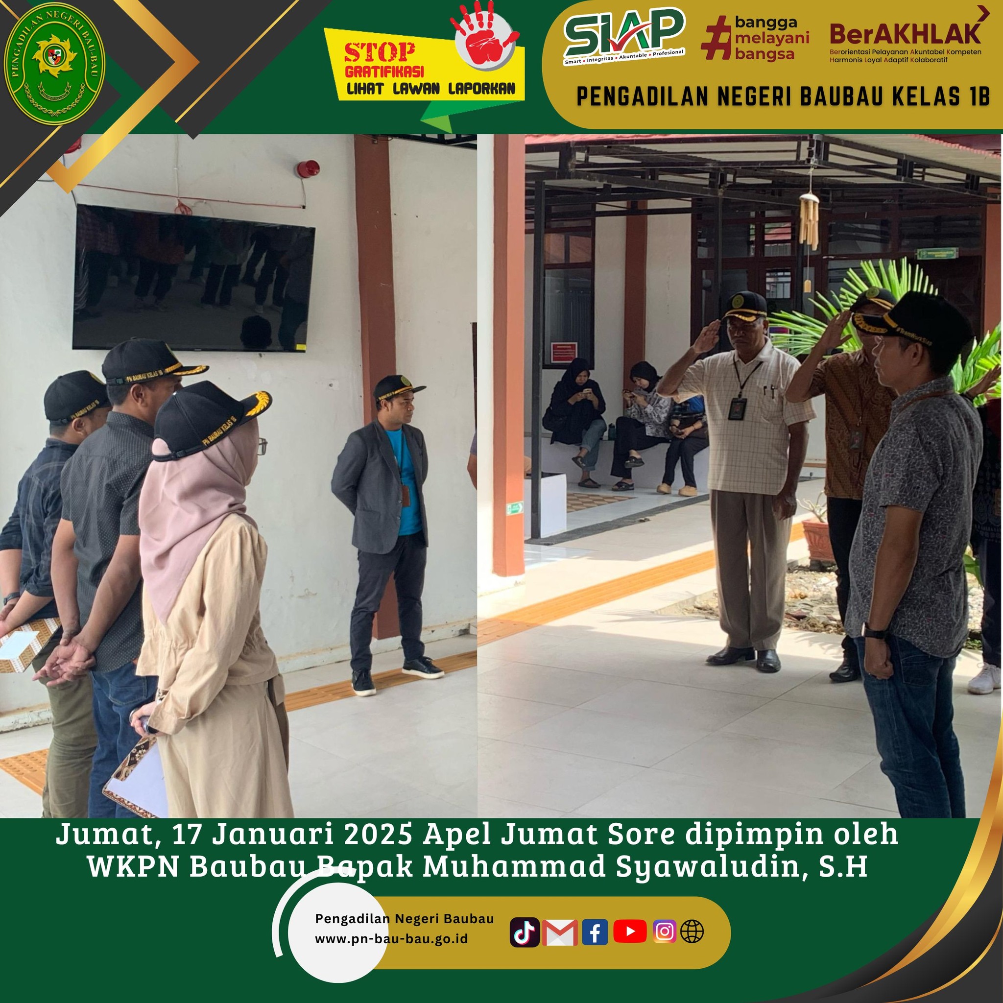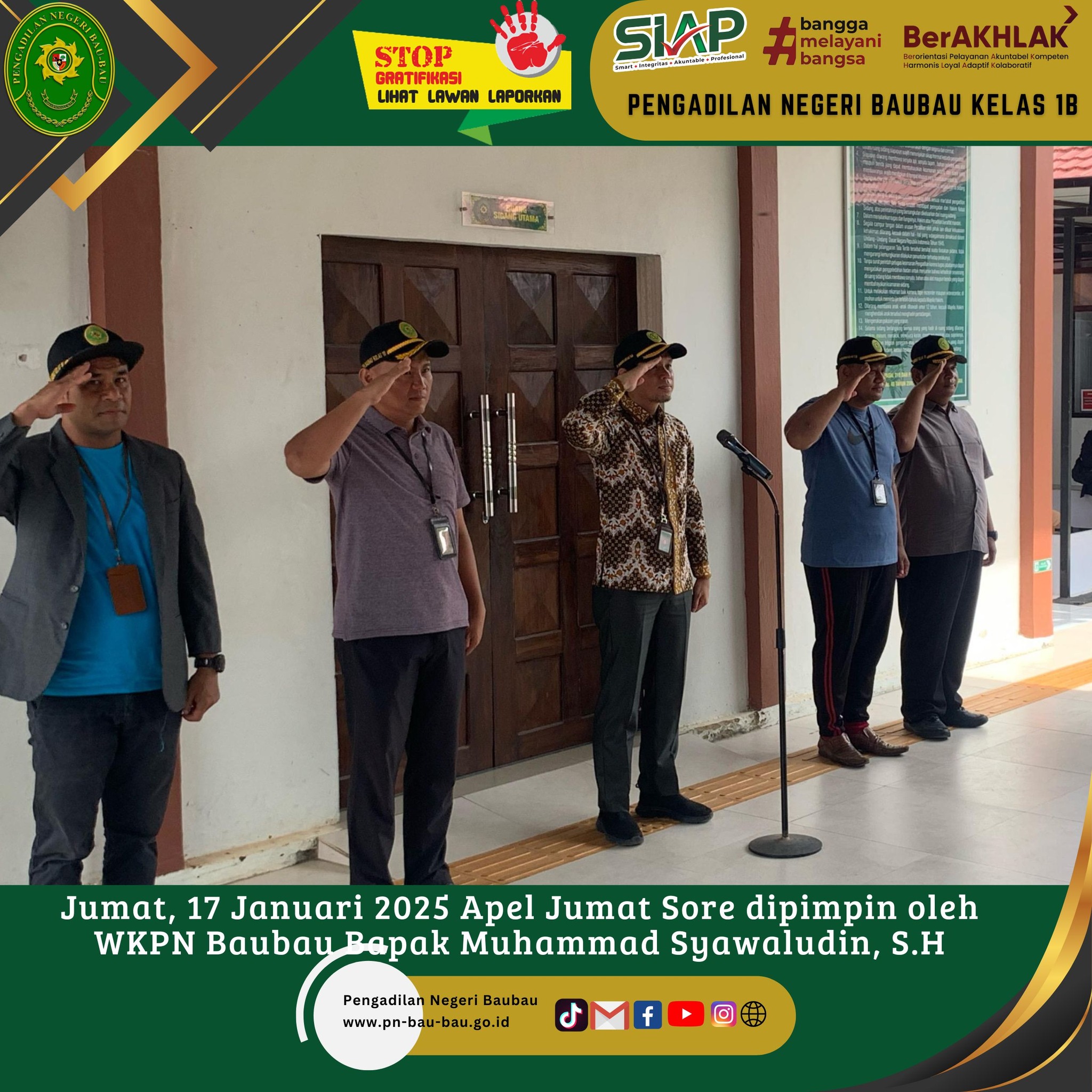 Jumat, 17 Januari 2025 Pelaksanaan Apel Jumat Sore di Pengadilan Negeri Baubau dipimpin oleh Bpk Muhammad Syawaludin.,S.H. Wakil Ketua Pengadilan Negeri Baubau.