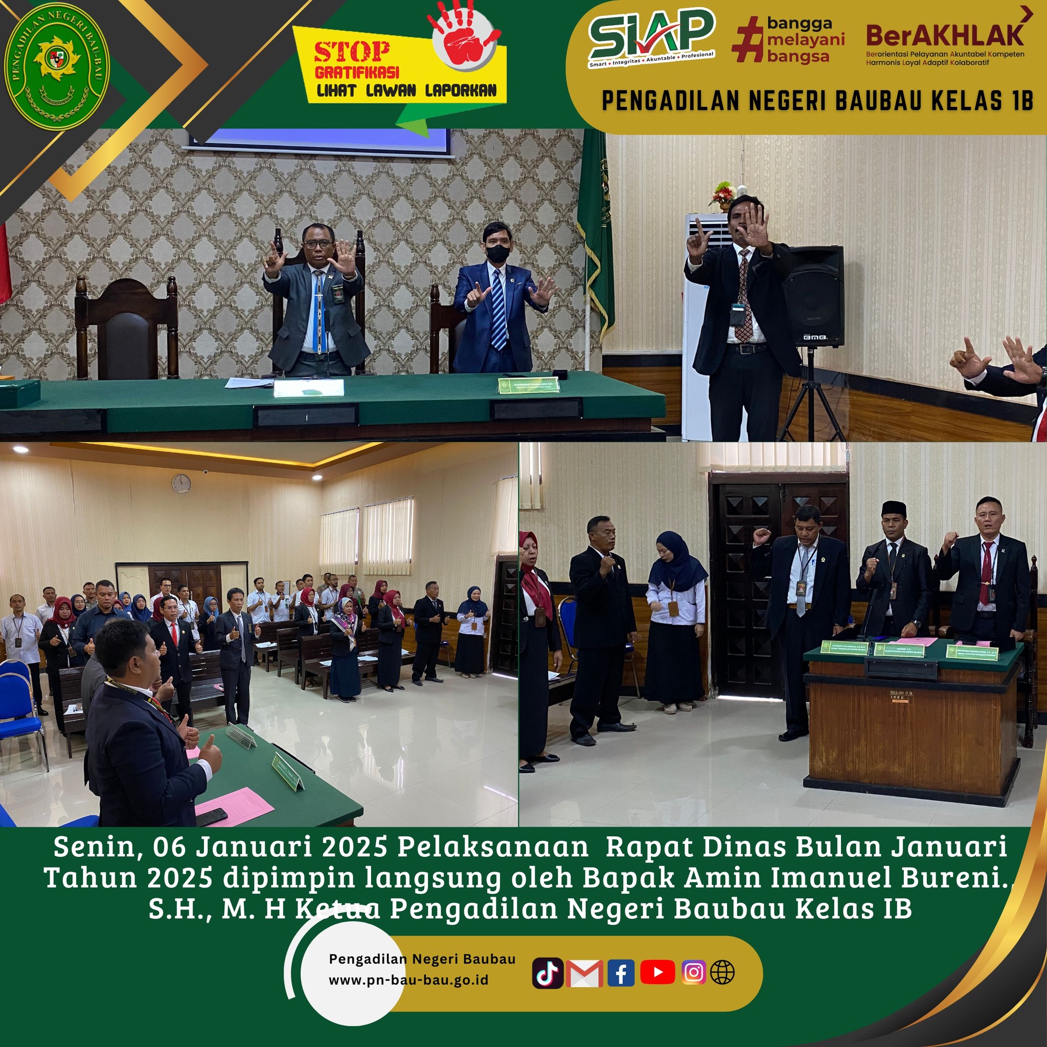 Senin, 06 Januari 2025 Pelaksanaan Rapat Dinas Bulan Januari Tahun 2025 dipimpin langsung oleh Bapak Amin Imanuel Bureni., S.H., M. H Ketua Pengadilan Negeri Baubau Kelas IB.