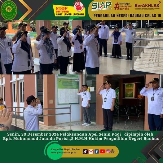 Senin., 30 Desember 2024 Pelaksanaan Apel Senin Pagi di Pengadilan Negeri Baubau dipimpin oleh Bpk Muhammad Juanda Parisi.,S.H.,M.H Hakim Pengadilan Negeri Baubau