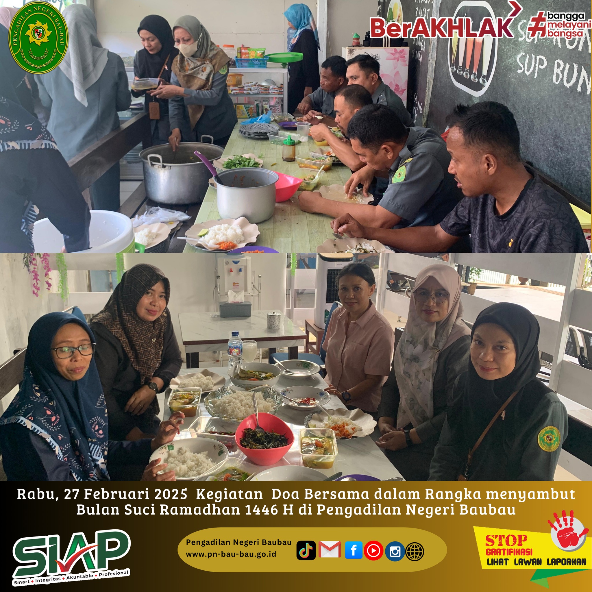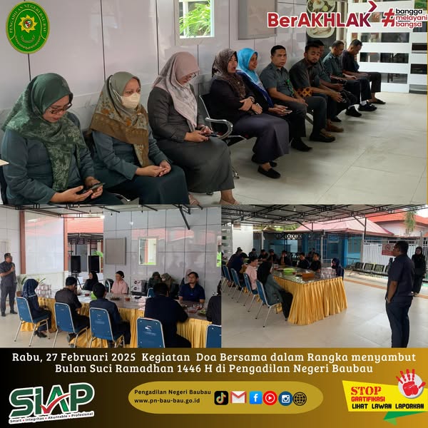 Rabu, 27 Februari 2025 Pelaksanaan Kegiatan Doa Bersama dalam Rangka menyambut Bulan Suci Ramadhan 1446 H di Pengadilan Negeri Baubau.