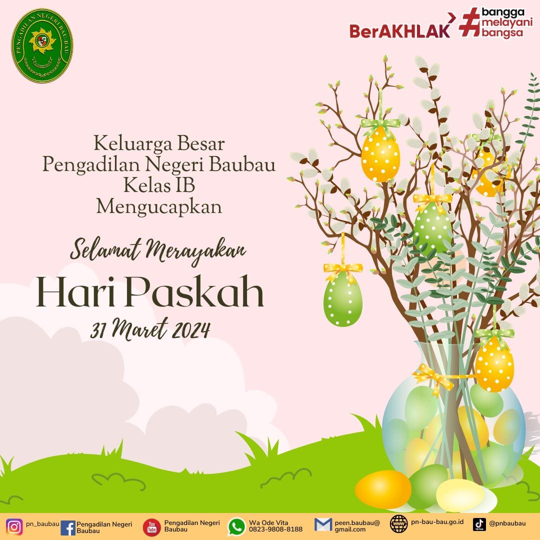 02 April 2024 Keluarga Besar Pengadilan Negeri Baubau mengucapkan Selamat Merayakan Hari Paskah. on Selasa, 02 April 2024. Posted in Berita/Pengumuman Publik Continue Reading