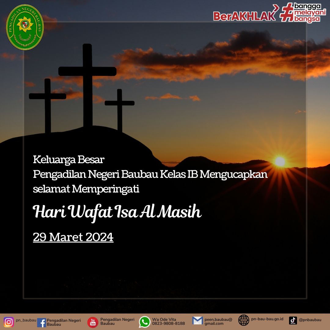 02 April 2024 Keluarga Besar Pengadilan Negeri Baubau Kelas IB mengucapkan selamat Memperingati Hari Wafat Isa Almasih Kamis, 29 Maret 2024 on Selasa, 02 April 2024. Posted in Berita/Pengumuman Publik Keluarga Besar Pengadilan Negeri Baubau Kelas IB mengucapkan selamat Memperingati Hari Wafat Isa AlmasihKamis, 29 Maret 2024 Continue Reading