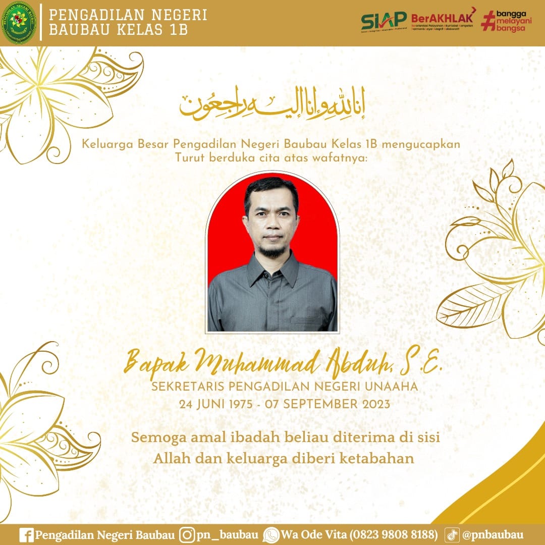 Keluarga Besar Pengadilan Negeri Baubau Kelas IB mengucapkan Turut Berduka cita atas wafatnya Bapak Muhammad Abduh, S.E Sekretaris pada Pengadilan Negeri Unaaha