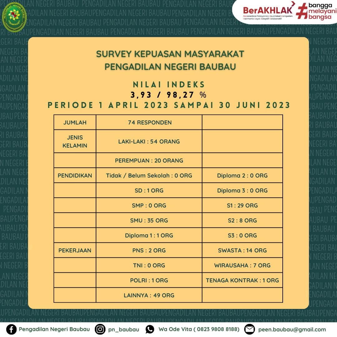 Survey Indeks Kepuasan Masyarakat (SKM) Pengadilan Negeri Baubau Periode Triwulan II (April sd Juni 2023).