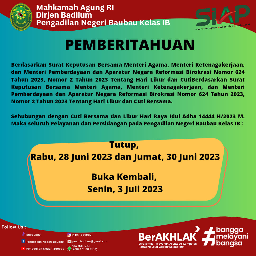 Pemberitahuan Sehubungan dengan Cuti Bersama dan Libur Hari Raya Idul Adha 14444 H/2023 M.