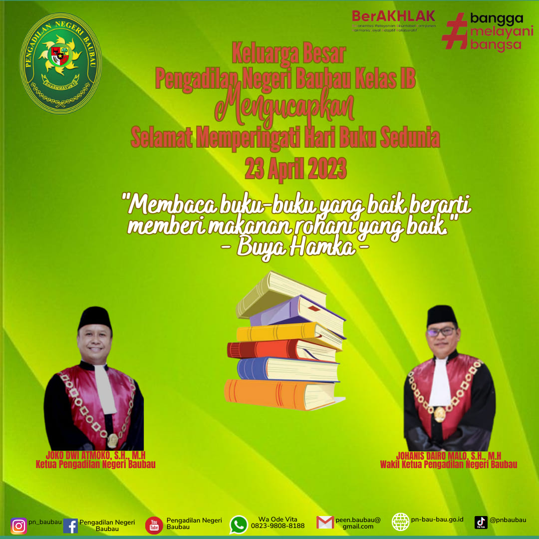 Keluarga Besar Pengadilan Negeri Baubau Kelas IB Mengucapkan Selamat Memperingati Hari Buku Sedunia 23 April 2023