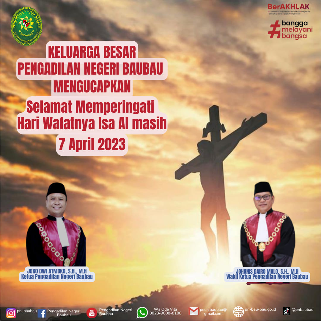 10 April 2023 Keluarga Besar Pengadilan Negeri Baubau mengucapkan selamat Memperingati Hari Wafatnya Isa Al Masih 7 April 2023 on Senin, 10 April 2023. Posted in Berita/Pengumuman Publik Keluarga Besar Pengadilan Negeri Baubau mengucapkan selamat Memperingati Hari Wafatnya Isa Al Masih 7 April 2023 Continue Reading
