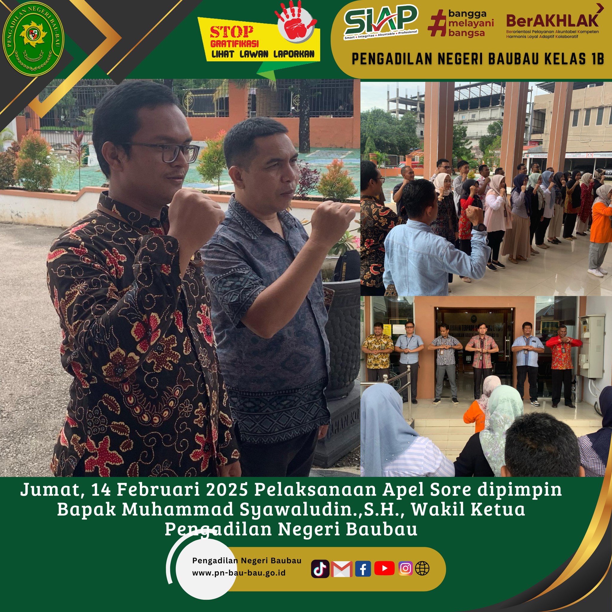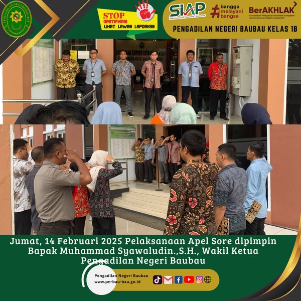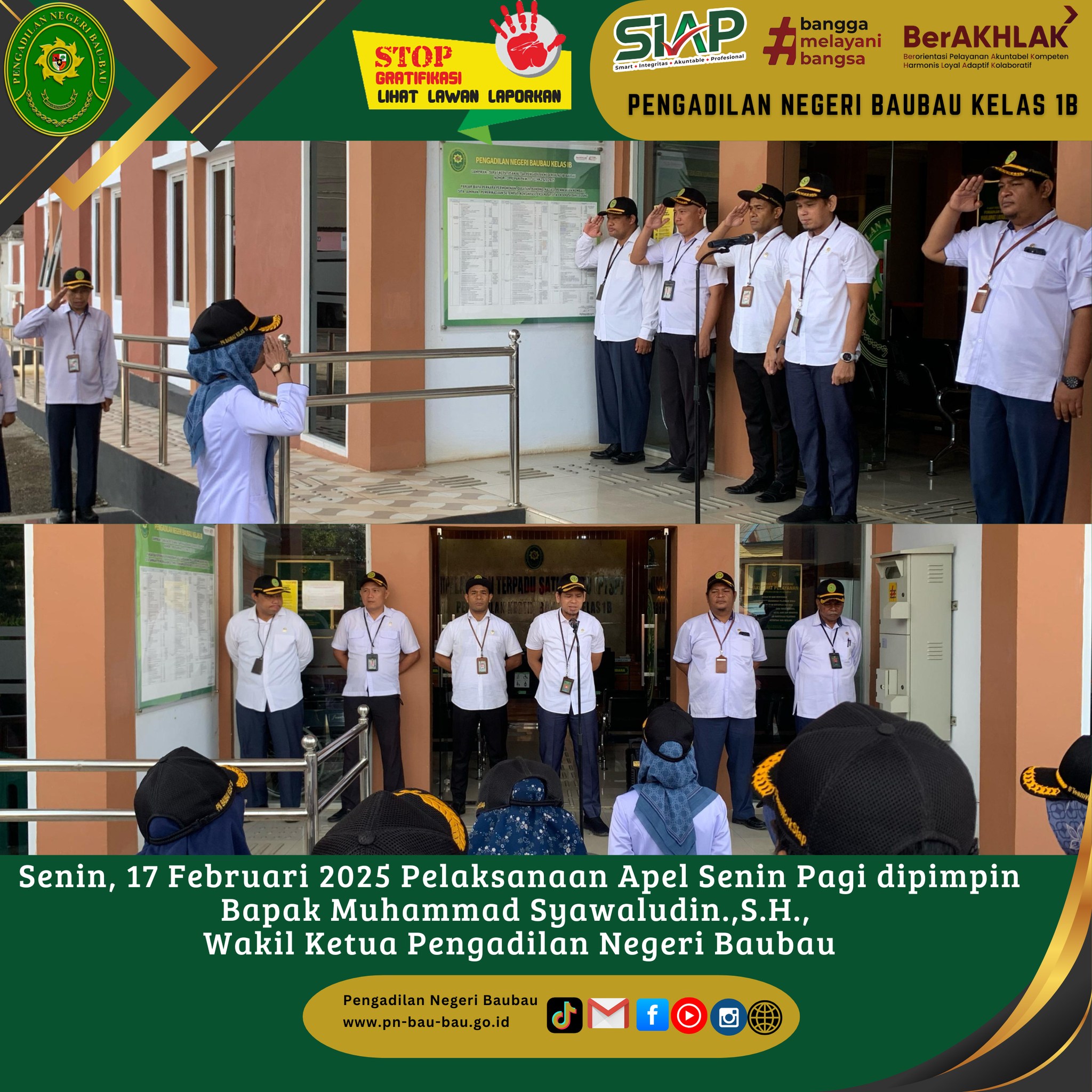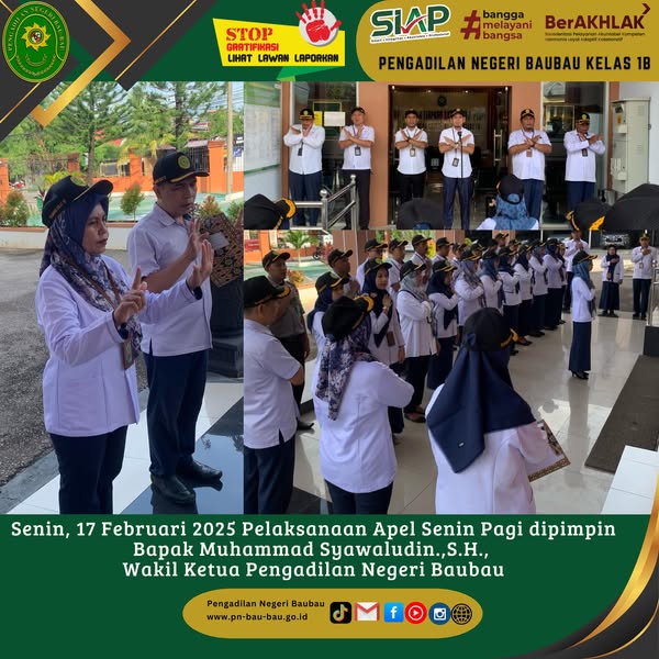 Senin, 17 Februari 2025 Pelaksanaan Apel Senin Pagi di Pengadilan Negeri Baubau dipimpin oleh Bpk Muhammad Syawaludin.,S.H. Wakil Ketua Pengadilan Negeri Baubau.