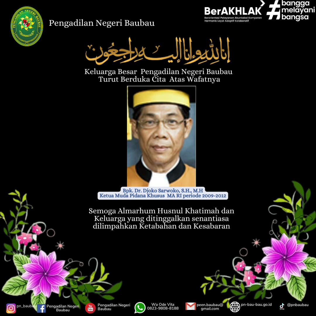 Keluarga Besar Pengadilan Negeri Baubau Turut Berduka Cita Atas Wafatnya Bapak Dr. Djoko Sarwoko, S.H., M.H Ketua Muda Pidana MA RI periode 2009 - 2012.