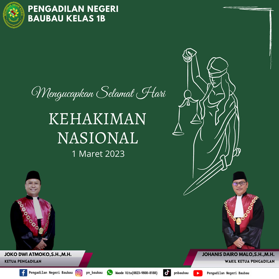 Keluarga Besar Pengadilan Negeri Baubau mengucapkan selamat memperingati Hari Kehakiman Nasional 1 Maret 2023.