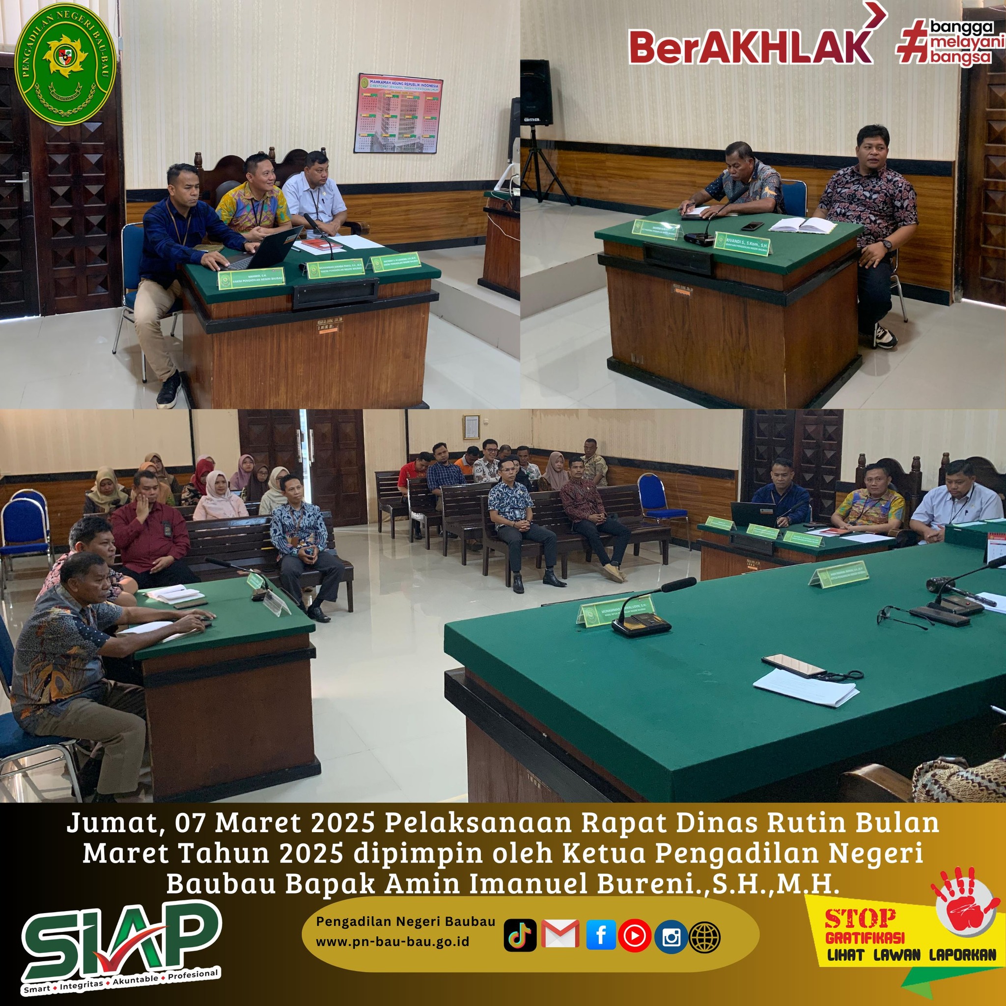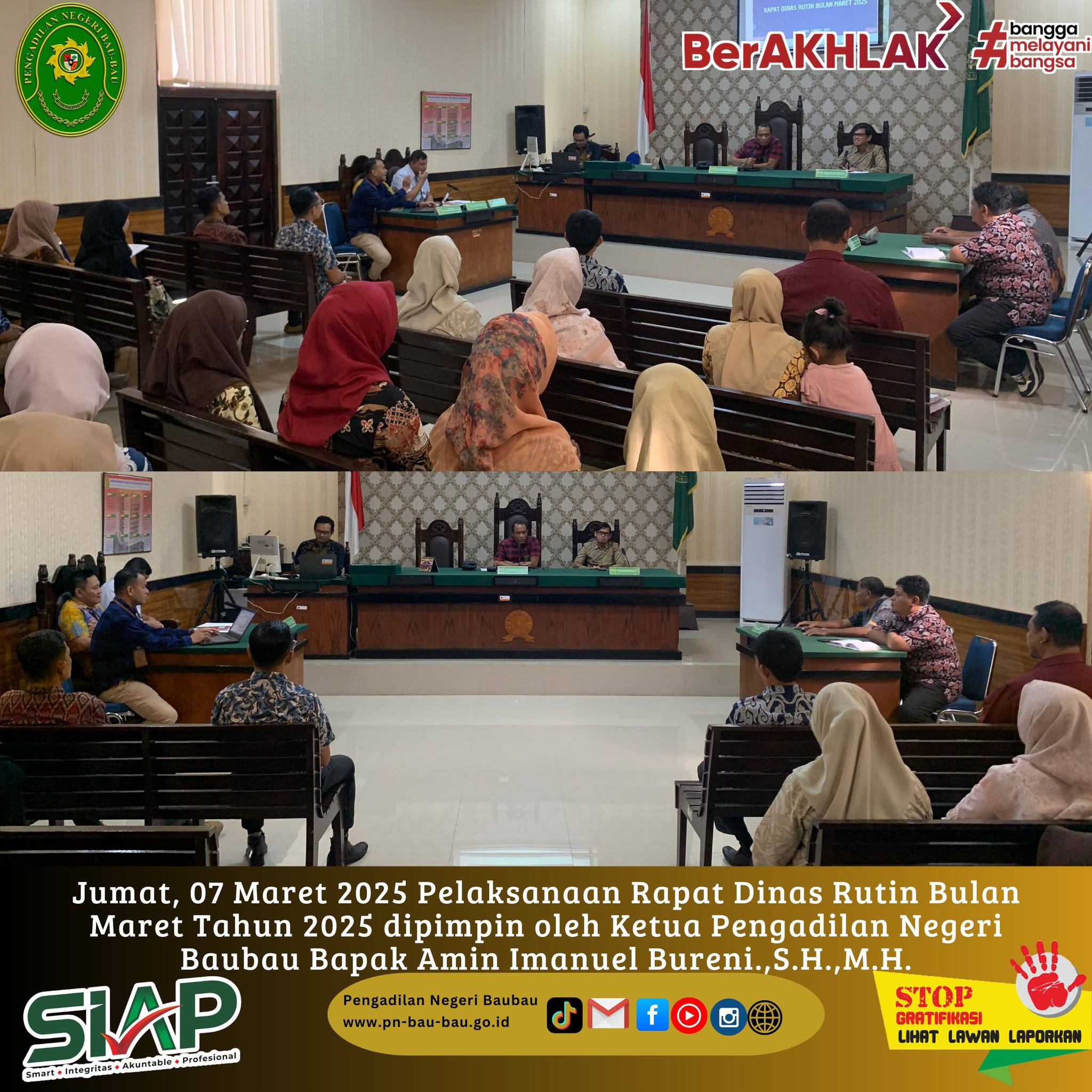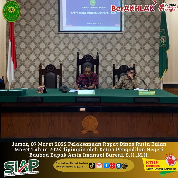 Jumat, 07 Maret 2025 Pelaksanaan Rapat Dinas Bulan Maret Tahun 2025 dipimpin oleh Ketua Pengadilan Negeri Baubau Bapak Amin Imanuel Bureni.,S.H.,M.H.
