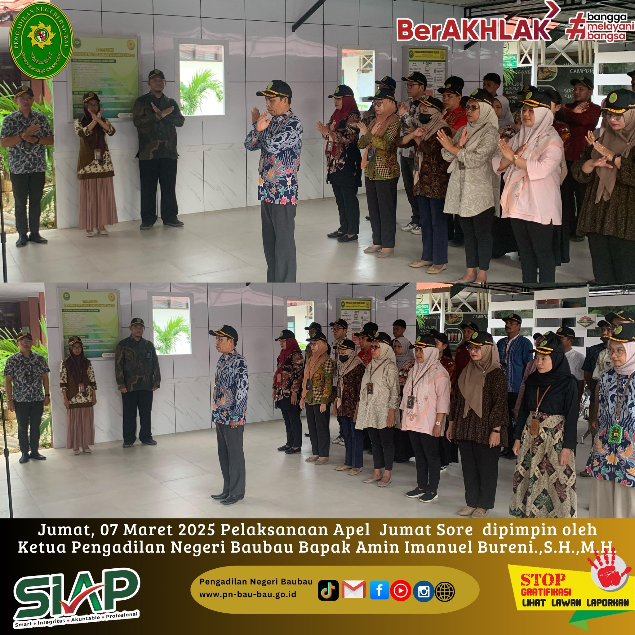 Jumat, 7 Maret 2025 Pelaksanaan Apel Jumat Sore di Pengadilan Negeri Baubau dipimpin oleh Bpk Amin Imanuel Bureni.,S.H.,M.H. Ketua Pengadilan Negeri Baubau.
