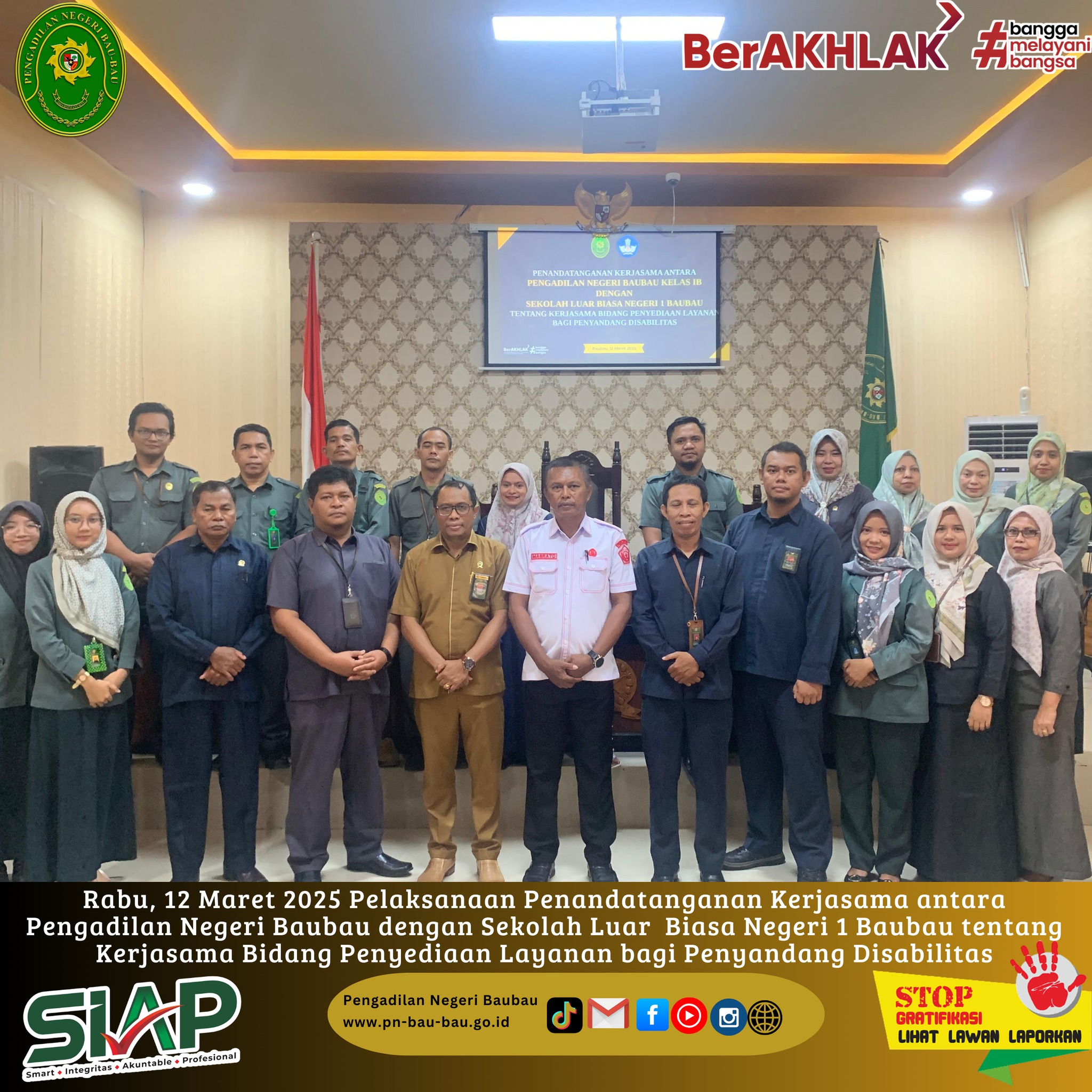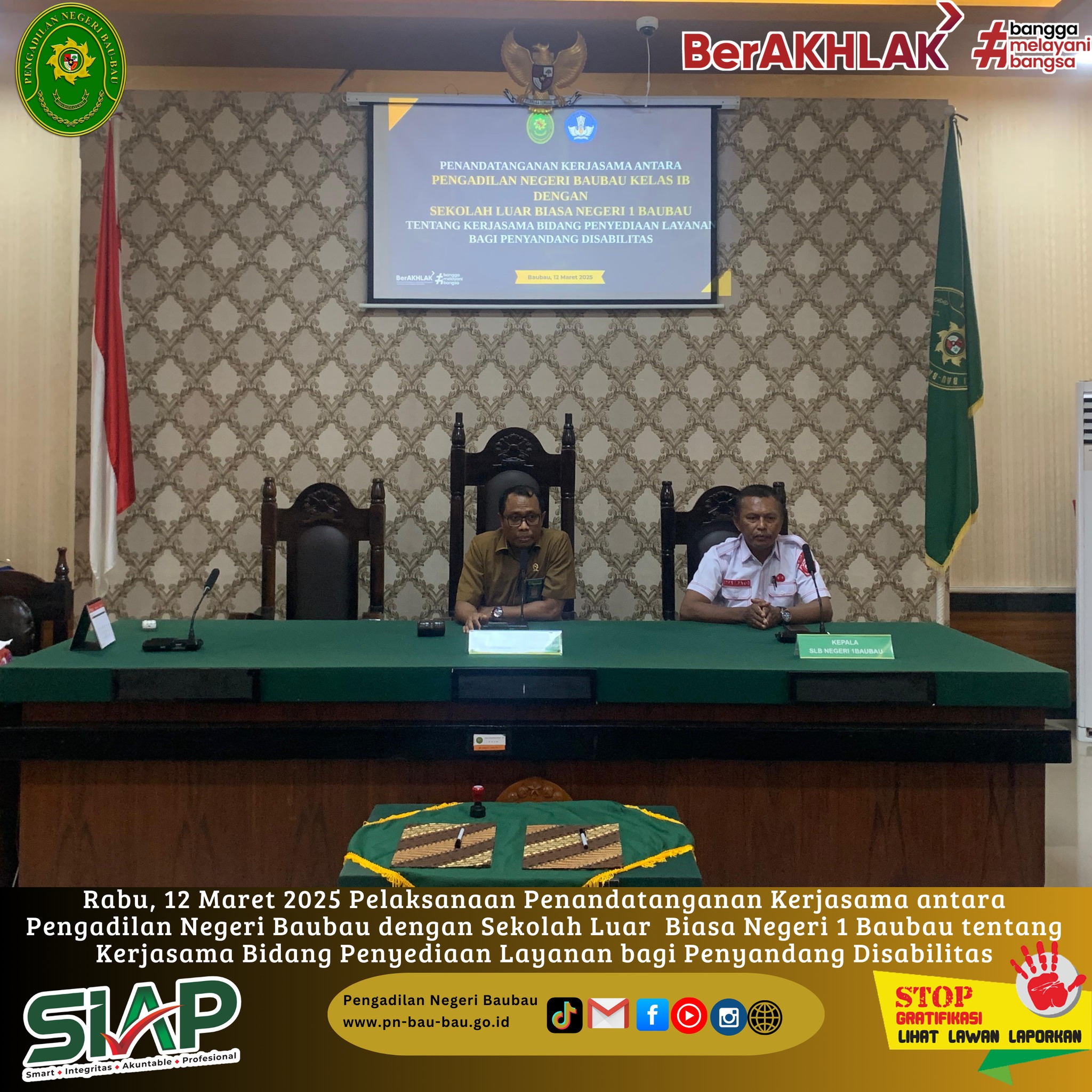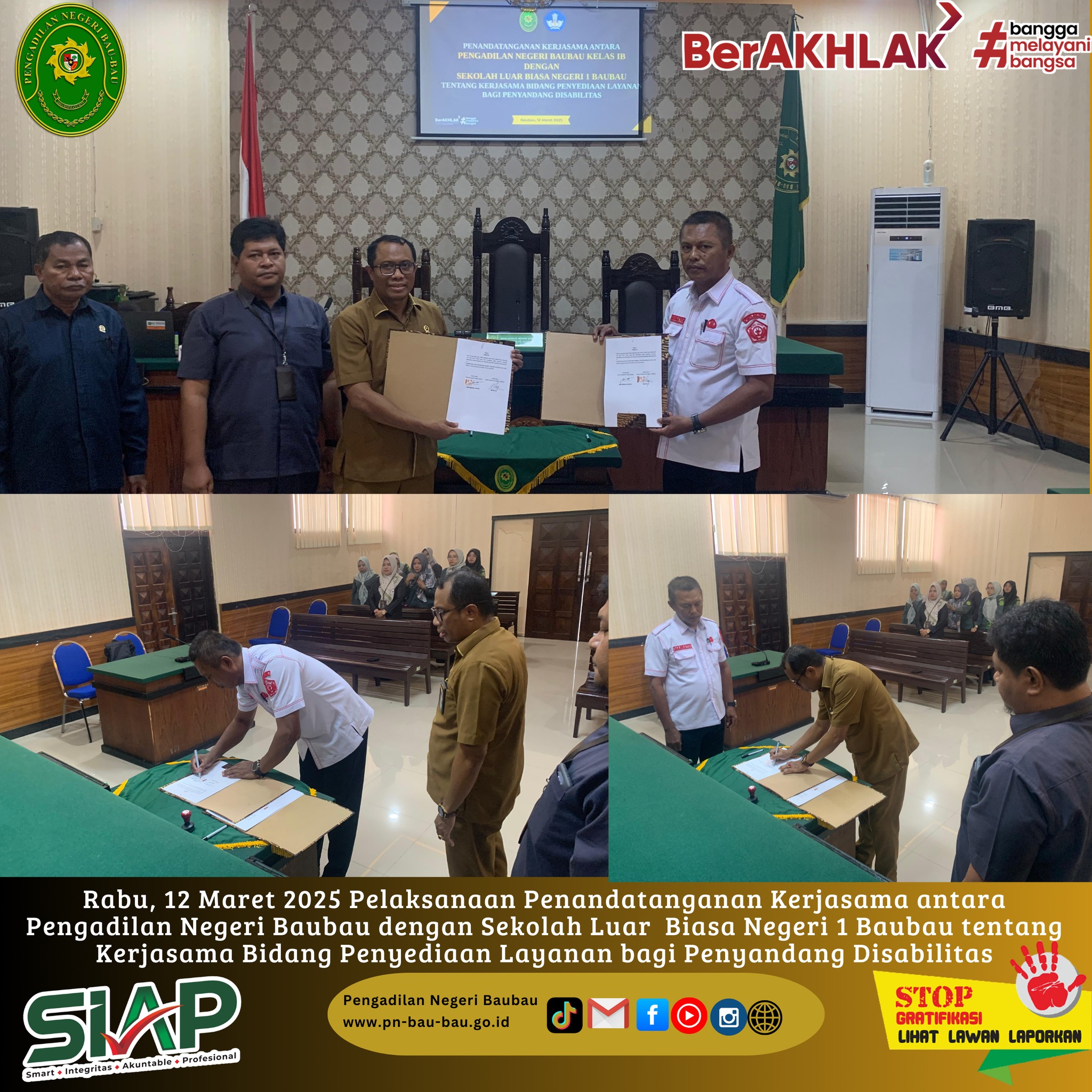 Rabu, 12 Maret 2025 Pelaksanaan Penandatanganan Kerjasama antara Pengadilan Negeri Baubau dengan Sekolah Luar Biasa Negeri 1 Baubau tentang Kerjasama di Bidang Penyediaan Layanan bagi Penyandang Disabilitas.