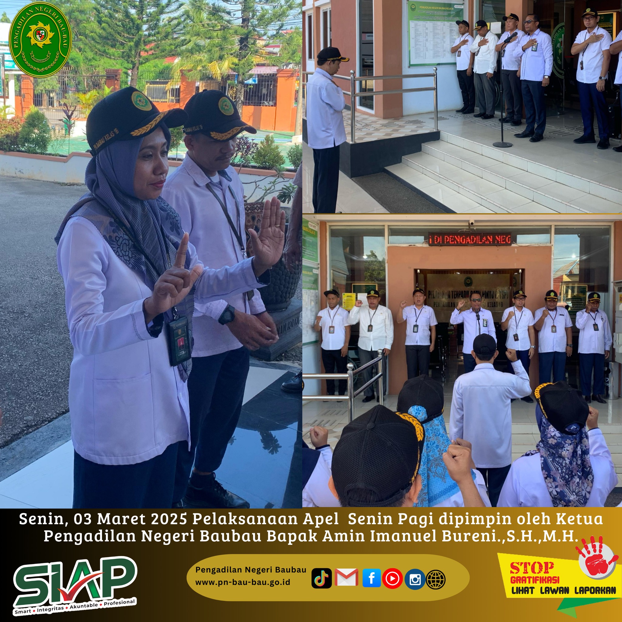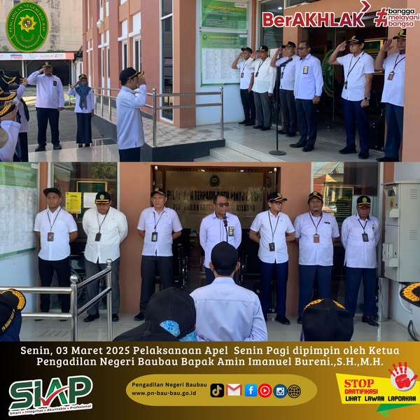 Senin, 03 Maret 2025 Pelaksanaan Apel Senin Pagi di Pengadilan Negeri Baubau dipimpin oleh Bpk Amin Imanuel Bureni.,S.H.,M.H. Ketua Pengadilan Negeri Baubau.