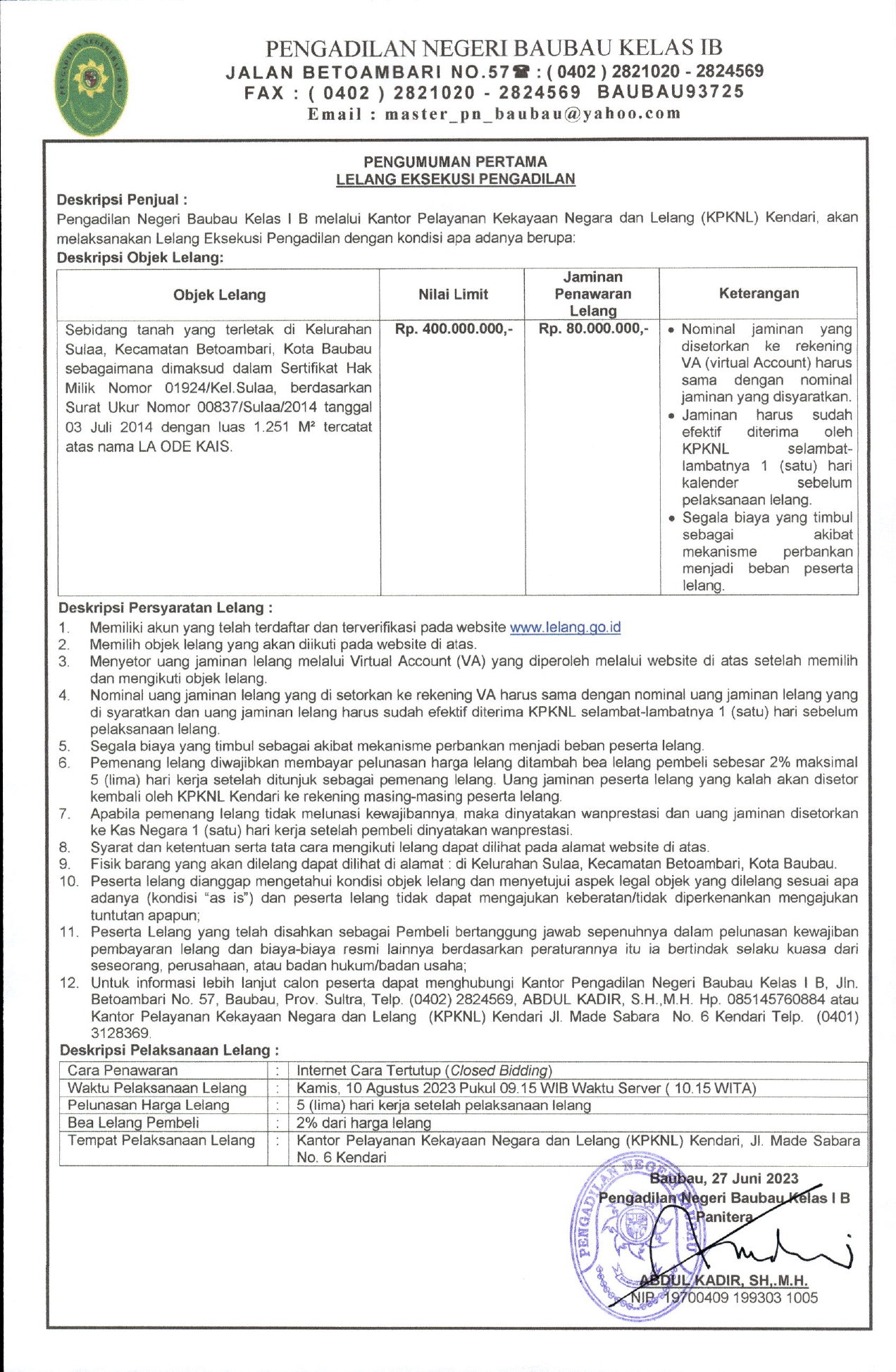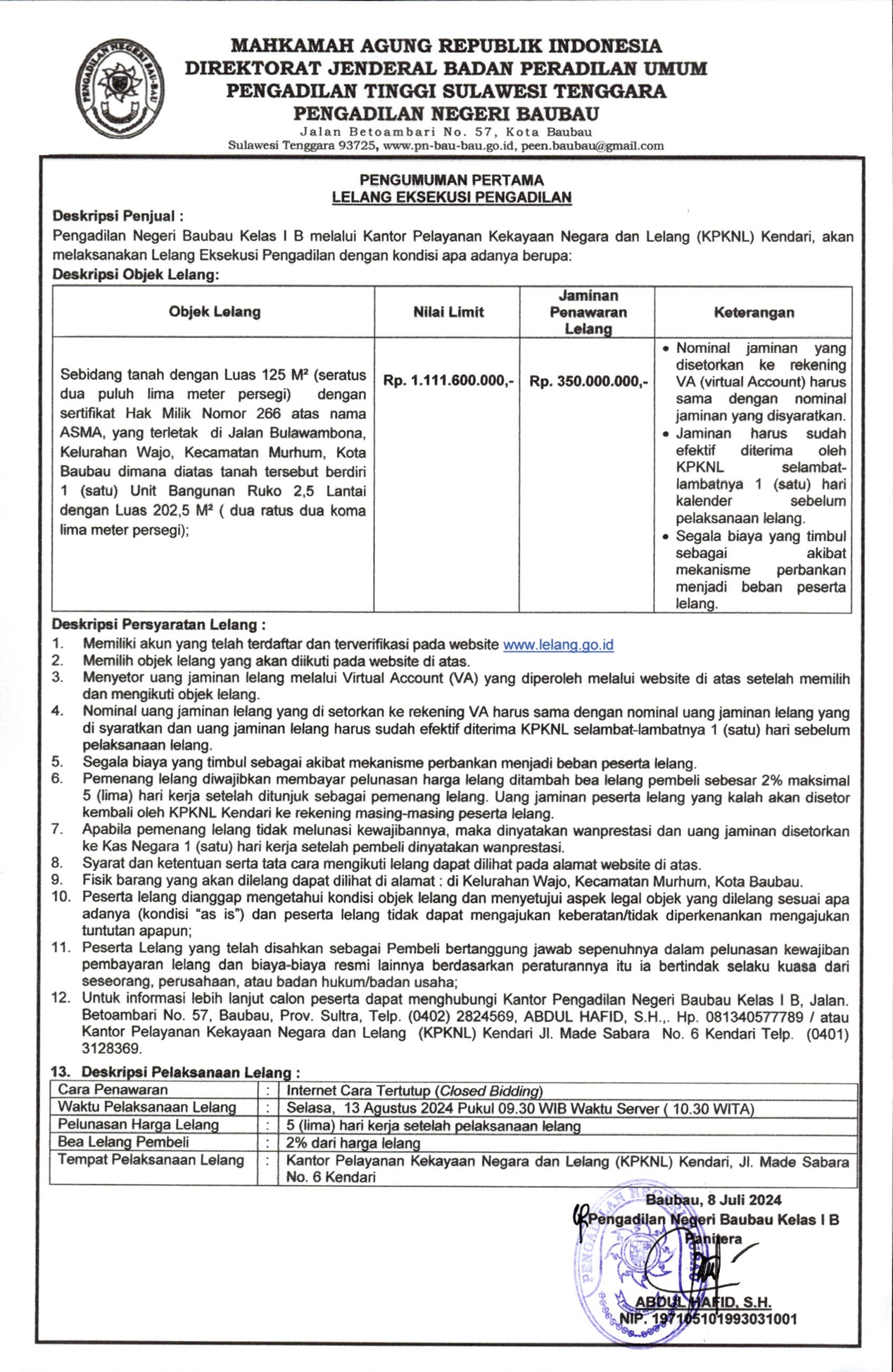 Pengumuman Pertama Lelang Eksekusi Pengadilan