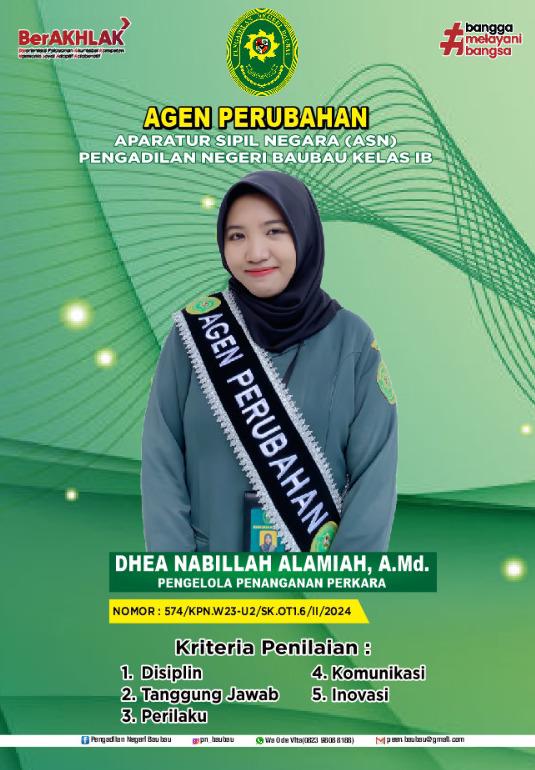 Profil Agen Perubahan Profil Singkat 1 Nama DHEA NABILLAH ALAMIAH, A.Md. 2 NIP 19990615 202203 2 015 3 Pangkat/Gol.Ruang Pengatur (II/c) 4 Tempat / Tanggal Lahir Jakarta, 15 Juni 1999 5 Jenis Kelamin Perempuan 6 Agama Islam